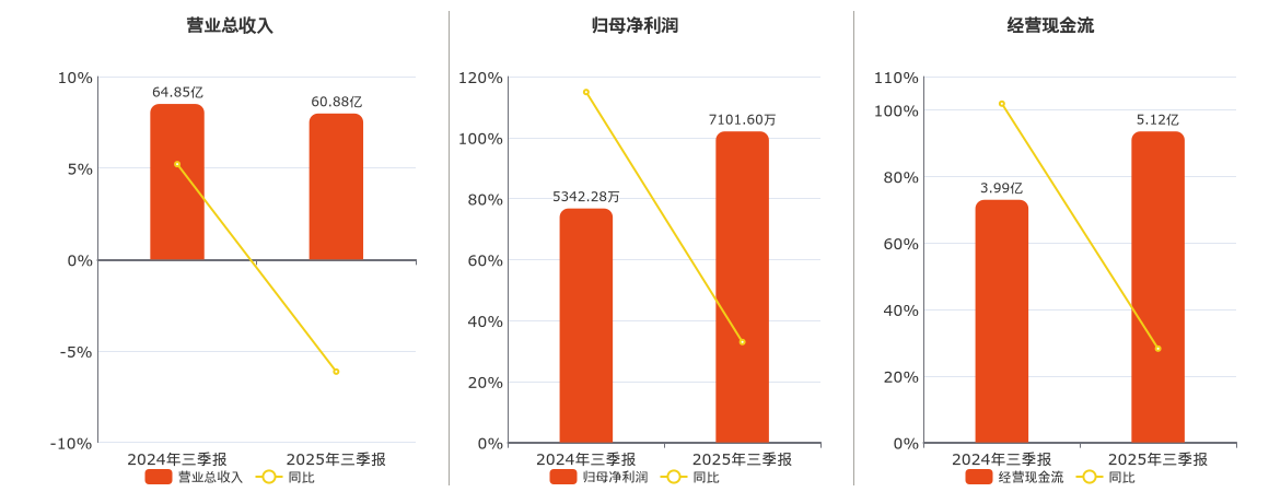 公司营业总收入为60.88亿元,较去年同报告期营业总收入减少3.97亿元,同比较去年同期下降6.13%。归母净利润为7101.60万元。经营活动现金净流入为5.12亿元。
