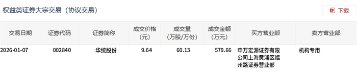 华统股份今日大宗交易平价成交60.13万股,成交额579.66万元