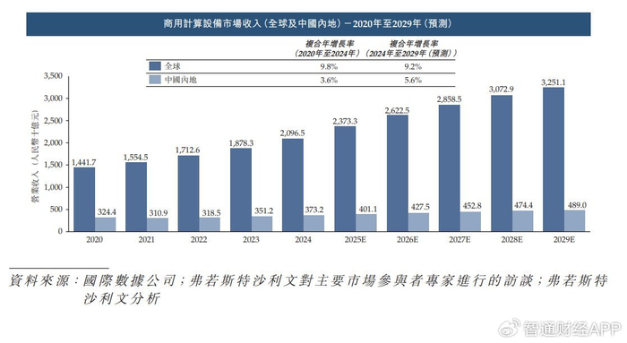 商用计算设备市场方面,全球商用计算设备市场营业收入从2020年人民币14,417亿元增至2024年人民币20,965亿元,复合年增长率为9.8%。未来,随产品迭代及高性能计算设备需求增长,全球商用计算设备市场营业收入预计至2029年达人民币32,511亿元,2024年至2029年复合年增长率为9.2%。中国内地商用计算设备市场营业收入从2020年人民币3,244亿元增至2024年人民币3,732亿元,复合年增长率为3.6%。未来,随技术创新及应用扩展,市场预计恢复稳步增长,至2029年中国内地商用计算设备市场营业收入达人民币4,890亿元,2024年至2029年复合年增长率为5.6%。