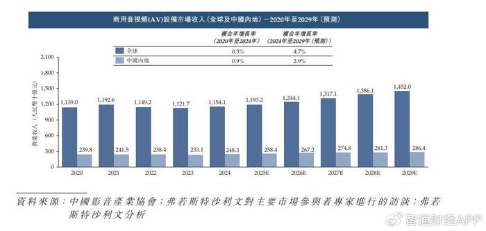 商用音视频(AV)设备市场方面,随新兴市场需求增长及应用场景进一步扩展,商用音视频(AV)设备市场预计稳步增长。至2029年,全球营业收入预计达人民币14,520亿元,2024年至2029年复合年增长率为4.7%,而中国内地营业收入预计达人民币2,864亿元,2024年至2029年复合年增长率为2.9%。