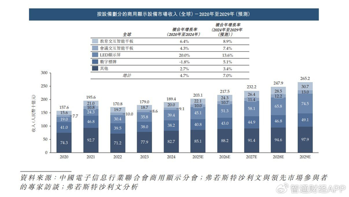 受商用显示设备技术进步及市场需求稳步增长驱动,全球商用显示设备市场营业收入规模从2020年人民币1,576亿元增至2024年人民币1,894亿元,复合年增长率为4.7%。具体而言,2024年教育交互智能平板、会议交互智能平板、LED显示屏及数字标牌的营业收入分别达人民币200亿元、人民币91亿元、人民币394亿元及人民币382亿元,2020年至2024年复合年增长率分别为6.4%、4.3%、20.0%及-1.8%。预计至2029年,全球商用显示设备市场营业收入规模将达人民币2,652亿元,2024年至2029年复合年增长率为7.0%。其中,教育交互智能平板、会议交互智能平板、LED显示屏及数字标牌的收入预计分别达人民币307亿元、人民币130亿元、人民币745亿元及人民币491亿元,2024年至2029年复合年增长率分别为8.9%、7.4%、13.6%及5.1%。