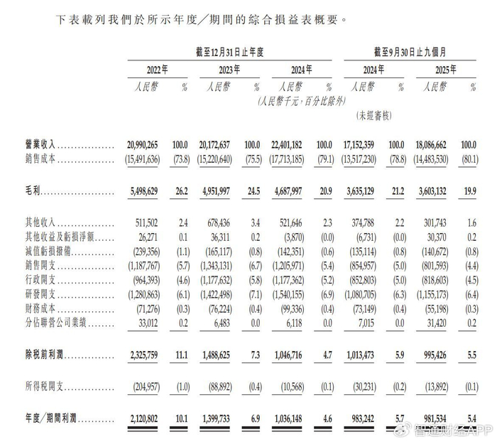 于2022年度、2023年度、2024年度、2025年截至9月30日止九个月,公司年度/期间利润分别约为人民币21.21亿元、14亿元、10.36亿元、9.82亿元。
