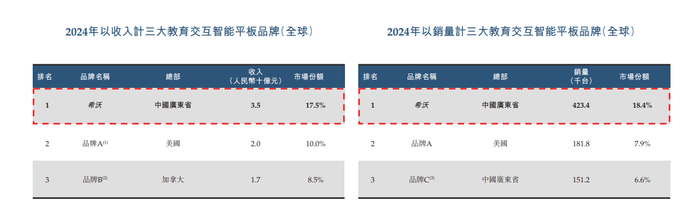 2024年,按教育交互智能平板营业收入计,全球前三大品牌合共占36.0%,而本集团品牌希沃以17.5%的市场份额位居全球第一。2024年,全球教育交互智能平板销量达230.1万台。按教育交互智能平板销量计,全球前三大品牌合共占32.9%,而本集团品牌希沃以18.4%的市场份额位居全球第一。2024年,中国内地教育交互智能平板收入规模达到人民币65亿元,本集团希沃品牌以53.8%的市场份额位居中国内地第一。2024年,中国内地教育用交互智能平板销量规模达到83.45万台,本集团希沃品牌在中国内地市场中排名第一,市场份额为50.7%。