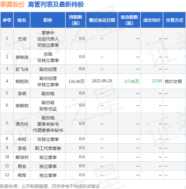 泰嘉股份:9月29日高管杨乾勋减持股份合计27万股