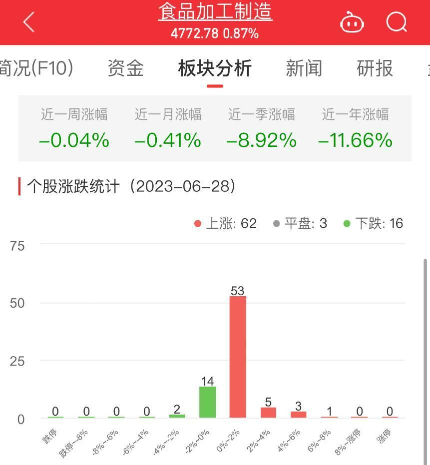 中国经济网北京6月28日讯 今日,食品加工制造板块整体涨幅0.87%,其中,62只股票上涨,3只股票平盘,16只股票下跌。