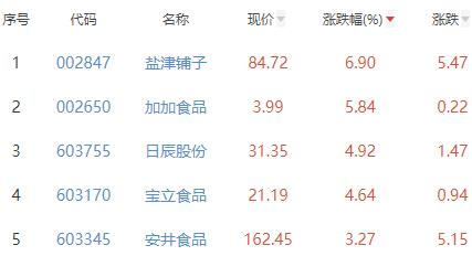 其中,盐津铺子、加加食品、日辰股份、宝立食品、安井食品位列板块涨幅前五位,涨幅分别为6.90%、5.84%、4.92%、4.64%、3.27%。