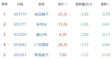 良品铺子、来伊份、康比特、广州酒家、青海春天位列涨幅榜后五位,涨幅分别为-2.69%、-2.65%、-2.00%、-1.57%、-1.27%。