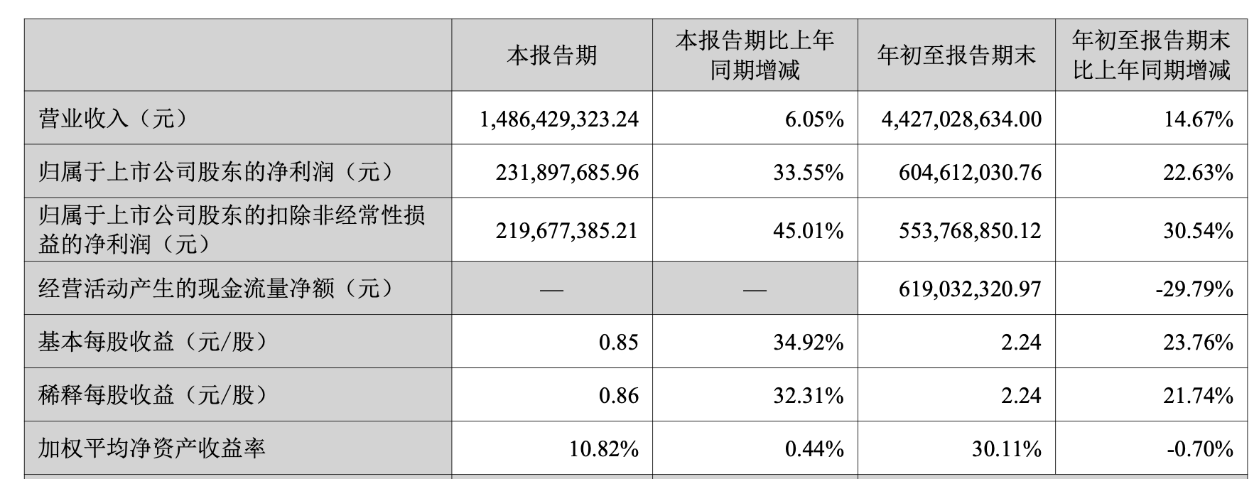 今年前三季度,营业收入44.27亿元,同比增长14.67%;归母净利润6.05亿元,同比增长22.63%。