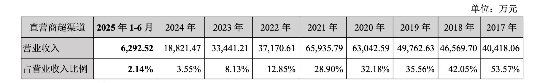 1-6月,公司直营的797个KA卖场,贡献营收不足0.7亿元。这一渠道的收入占比逐年变小,由2017年的53.57%,下滑至现在的2.14%。