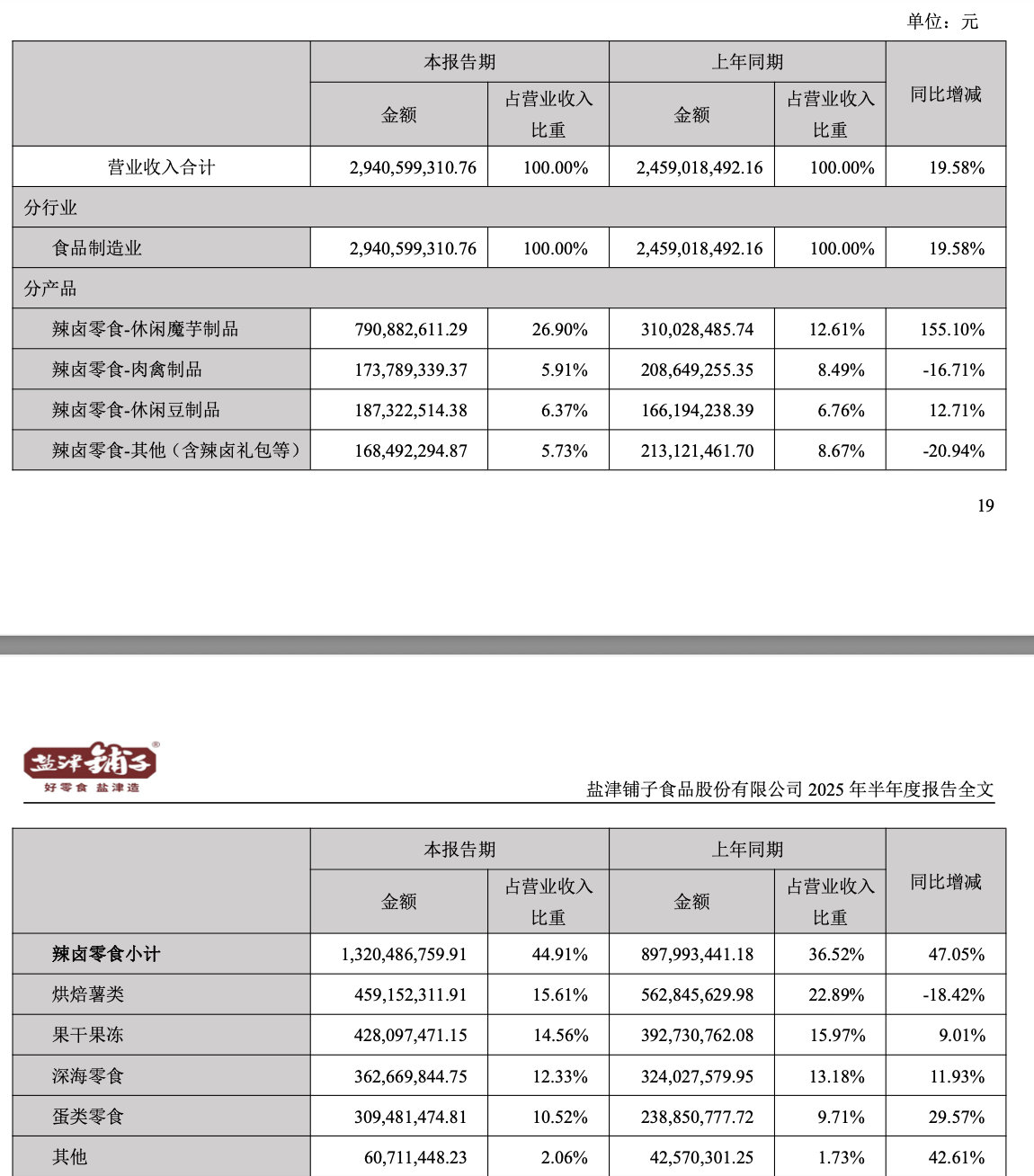“辣卤零食”是绝对的营收主力军。1-6月,这一业务贡献13.2亿元,占总营收的超四成。