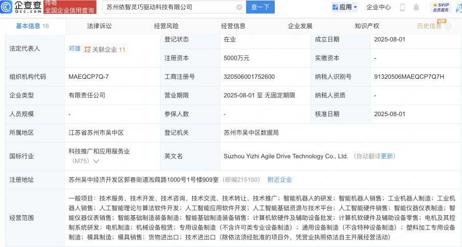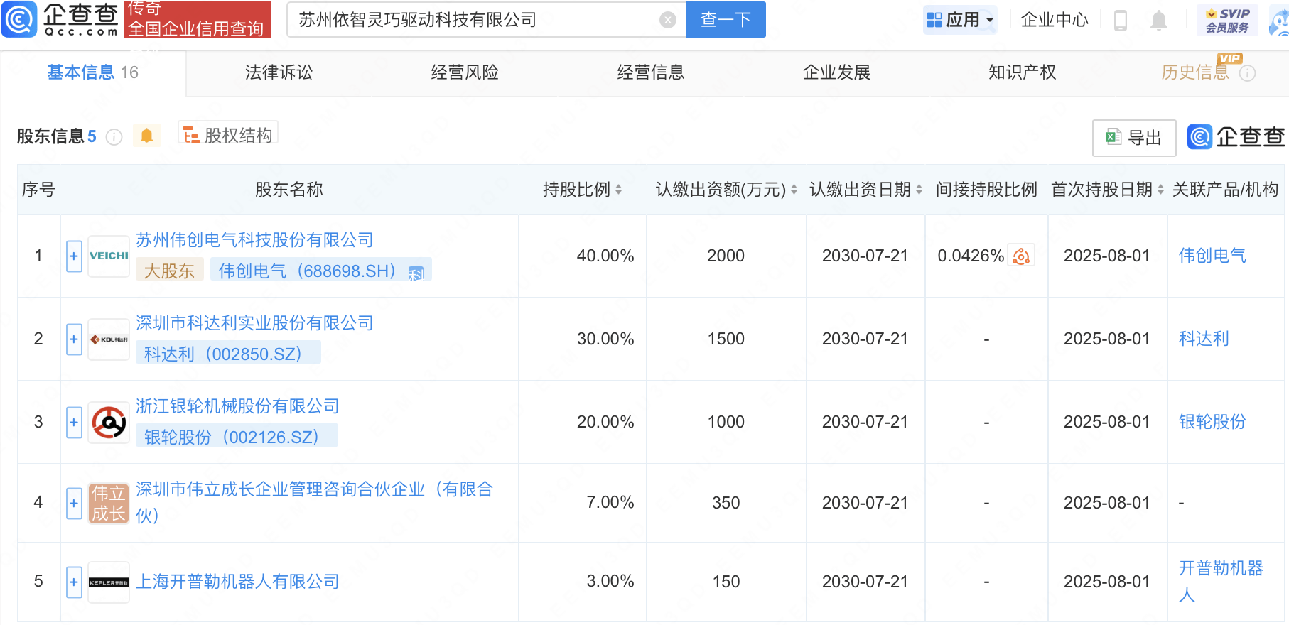 企查查APP显示,近日,苏州依智灵巧驱动科技有限公司成立,注册资本5000万元,经营范围包含:智能机器人的研发;智能机器人销售;人工智能应用软件开发;人工智能基础资源与技术平台;人工智能硬件销售等。企查查股权穿透显示,该公司由伟创电气(688698)、科达利(002850)、银轮股份(002126)、上海开普勒机器人有限公司等共同持股。