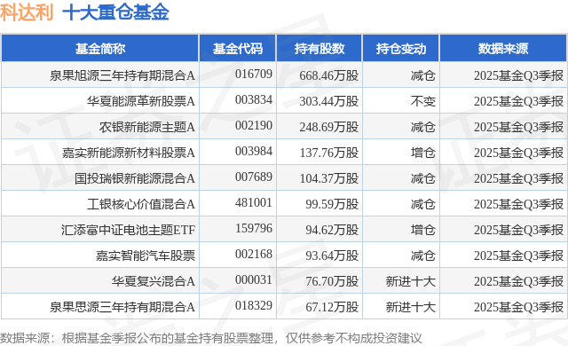 重仓科达利的前十大公募基金请见下表: