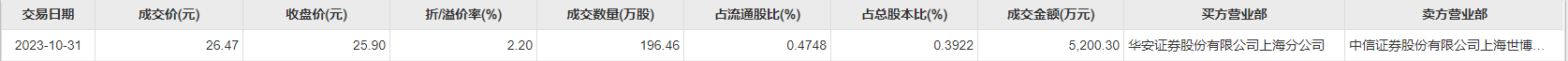 今日大宗交易成交196.46万股,成交额5200.3万元,占当日总成交额的11.85%,成交价26.47元,较市场收盘价溢价2.2%。