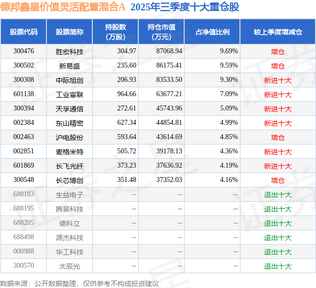 德邦鑫星价值灵活配置混合A的前十大重仓股如下: