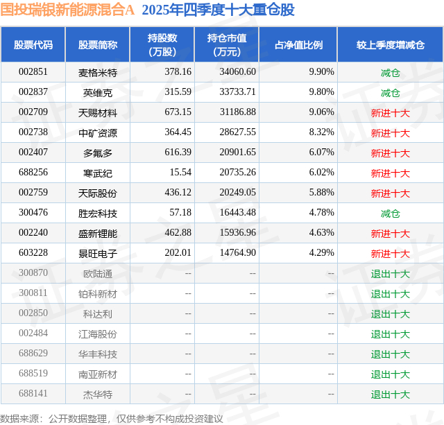 国投瑞银新能源混合A的前十大重仓股如下: