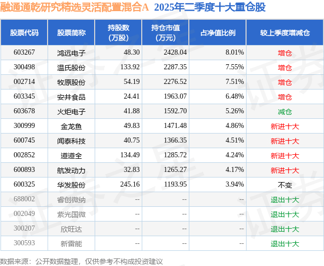 融通通乾研究精选灵活配置混合A的前十大重仓股如下: