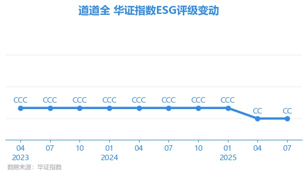 日前,华证指数公布了新一期(2025年7月31日)的ESG评级结果,道道全(002852.SZ)获得CC评级(华证指数评级为C起至AAA九档,C为最低档,AAA为其最高一级评级/AA为其第二档),上一期(2025年4月30日)ESG评级为CC。本期ESG评级在156家食品行业A股上市公司中排名第122(上一期排名第133)。