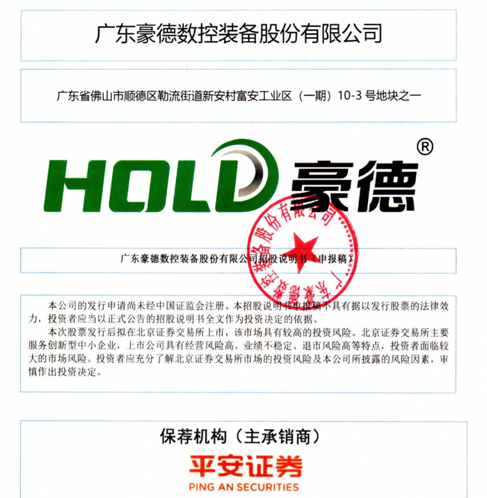 瑞财经 吴文婷5月26日,广东豪德数控装备股份有限公司(以下简称“豪德数控”)北交所IPO已获受理,保荐机构为平安证券股份有限公司,保荐代表人为陈曦、赵堃,会计师事务所为容诚会计师事务所(特殊普通合伙)。