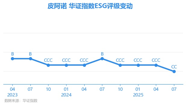 日前,华证指数公布了新一期(2025年7月31日)的ESG评级结果,皮阿诺(002853.SZ)获得CC评级(华证指数评级为C起至AAA九档,C为最低档,AAA为其最高一级评级/AA为其第二档),上一期(2025年4月30日)ESG评级为CCC。本期ESG评级在147家家庭耐用消费品行业A股上市公司中排名第103(上一期排名第96)。