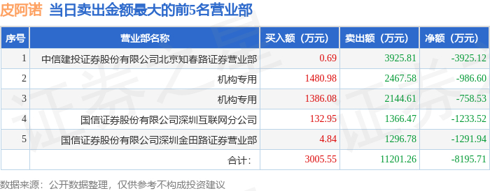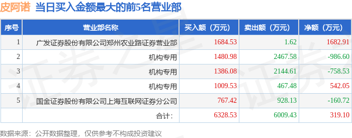 12月19日皮阿诺(002853)龙虎榜数据:机构净卖出1203.09万元