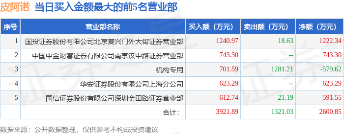 12月25日皮阿诺(002853)龙虎榜数据:机构净卖出2607.89万元