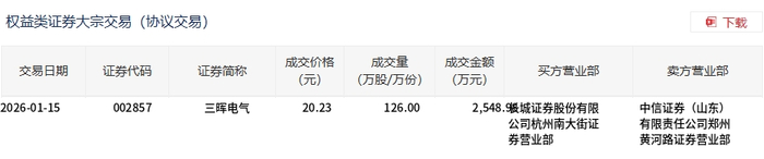三晖电气今日大宗交易折价成交126万股,成交额2548.98万元