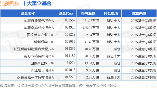 根据2025基金Q3季报公募基金重仓股数据,重仓该股的公募基金共9家,其中持有数量最多的公募基金为华夏基金的华夏行业景气混合A。华夏行业景气混合A目前规模为89.72亿元,最新净值4.7426(12月18日),较上一交易日上涨0.31%,近一年上涨50.7%。该公募基金现任基金经理为钟帅。钟帅在任的基金产品包括:华夏远见成长一年持有混合A,管理时间为2022年9月20日至今,期间收益率为32.7%;华夏招鑫鸿瑞混合A,管理时间为2024年1月16日至今,期间收益率为105.06%;华夏卓越成长混合A,管理时间为2025年8月12日至今,期间收益率为12.83%。