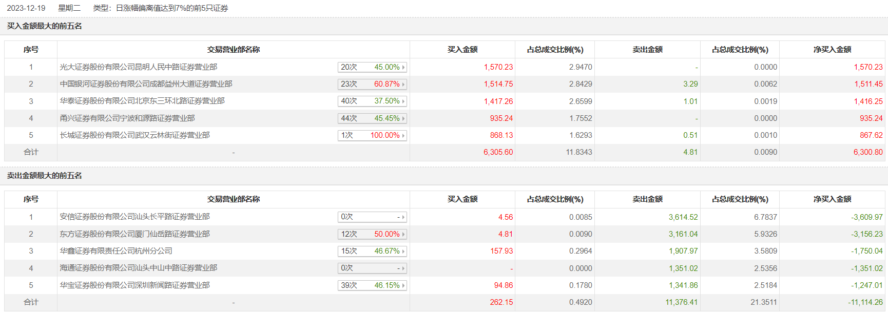 实丰文化12月19日涨停,全天换手率达23.49%,振幅达4.39%。龙虎榜数据显示,营业部席位合计净卖出4813.47万元。其中,光大证券(维权)昆明人民中路证券营业部、中国银河证券成都益州大道证券营业部分别买入1570.23万元、1514.75万元;安信证券汕头长平路证券营业部、东方证券厦门仙岳路证券营业部分别卖出3614.52万元、3161.04万元。