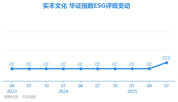 日前,华证指数公布了新一期(2025年7月31日)的ESG评级结果,实丰文化(002862.SZ)获得CCC评级(华证指数评级为C起至AAA九档,C为最低档,AAA为其最高一级评级/AA为其第二档),上一期(2025年4月30日)ESG评级为CC。本期ESG评级在30家休闲设备与用品行业A股上市公司中排名第25(上一期排名第24)。