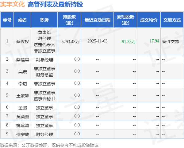 实丰文化近半年内的董监高及核心技术人员增减持详情如下: