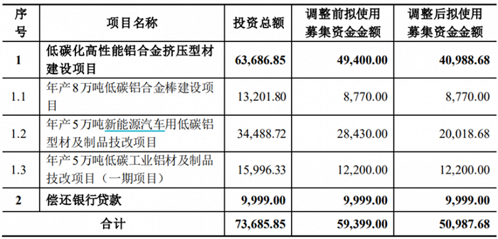 1月3日公告,拟将募投项目“低碳化高性能铝合金挤压型材建设项目”拟使用募集资金金额从4.94亿元调整为4.10亿元。