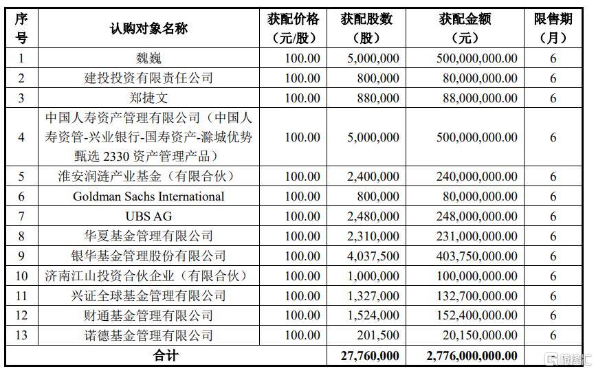 确定本次发行价格100元/股,募集资金总额27.76亿元。本次发行对象最终确定13家,其中