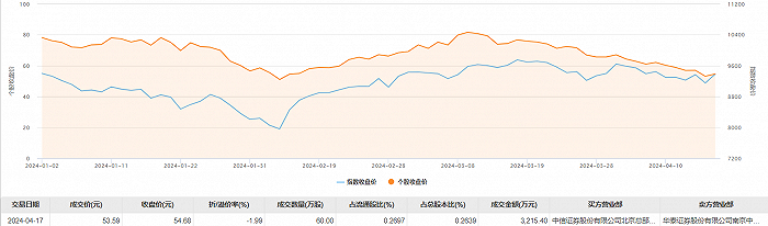 4月17日大宗交易成交60万股,成交额3215.4万元,占当日总成交额的7.95%,成交价53.59元,较市场收盘价54.68元折价1.99%。