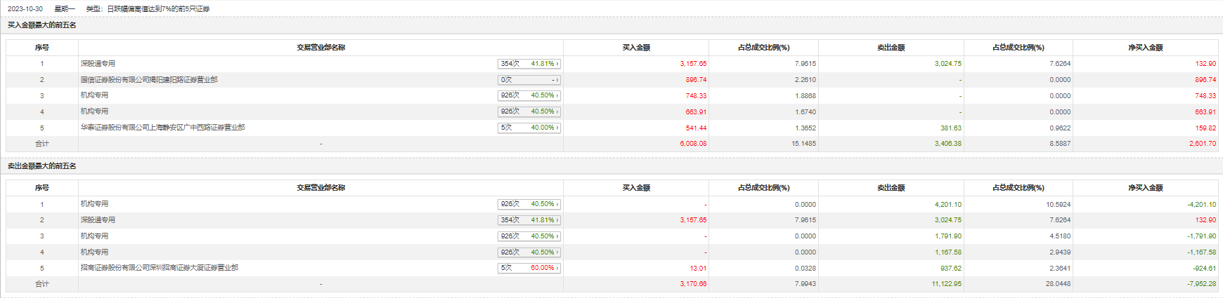 10月30日,周大生今日跌9.24%,全天换手率达2.42%,振幅达9.67%。龙虎榜数据显示,营业部席位合计净卖出5483.48万元。其中,机构买入1412.25万元,卖出7160.58万元,合计净卖出5748.33万元。此外,深股通专用、招商证券深圳招商证券大厦证券营业部分别卖出3024.75万元、937.62万元;深股通专用、国信证券揭阳建阳路证券营业部分别买入3157.65万元、896.74万元。