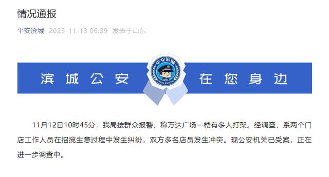 新京报讯 11月12日,有媒体发布视频称,山东滨州万达广场一楼有多人打架,疑似周大生老凤祥员工互殴。13日,滨州市公安局滨城分局发布情况通报:11月12日10时45分,我局接群众报警,称万达广场一楼有多人打架。经调查,系两个门店工作人员在招揽生意过程中发生纠纷,双方多名店员发生冲突。现公安机关已受案,正在进一步调查中。