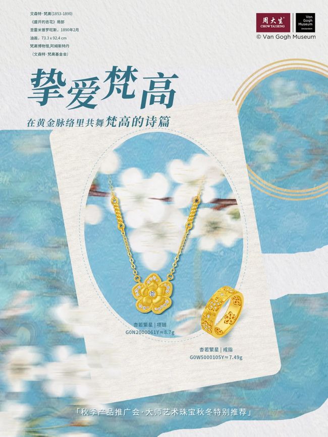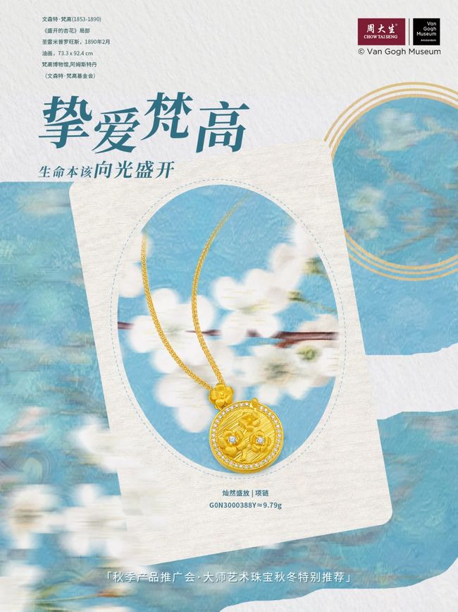 自2017年首次携手梵高IP以来,周大生大师艺术珠宝便开启了一场与这位印象派大师的深度精神共鸣之旅。截至2025年,这条文化探索之路更显深邃与宽广。品牌已正式与荷兰阿姆斯特丹梵高博物馆——全球珍藏梵高真迹最丰富的艺术殿堂达成合作,以珠宝为媒介,创新性诠释《盛开的杏花》《向日葵》等不朽画作的精神内核。这不仅是对艺术的具象化表达,更是对“向阳而生”“生生不息”人生态度的深刻呼应。