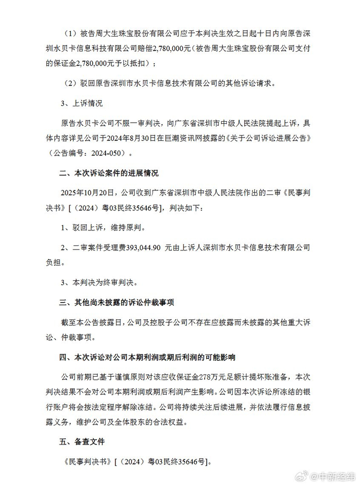 【#周大生2亿天价索赔案仅需赔278万#[馋嘴]】10月22日,周大生发布公告,关于公司收到《民事判决书》暨诉讼进展的情况。公司在二审中作为被上诉人,涉及的金额为7025万元。原告深圳市水贝卡信息科技有限公司因合同纠纷向公司提出诉讼,要求赔偿共计2.11亿元。由于该诉讼事项,公司部分银行账户被冻结。在一审中,法院判决公司应向原告赔偿278万元,并驳回了原告的其他诉讼请求。水贝卡公司对此不服,提起上诉。2025年10月20日,法院作出二审判决,驳回上诉,维持原判,并由上诉人负担39万元的案件受理费。