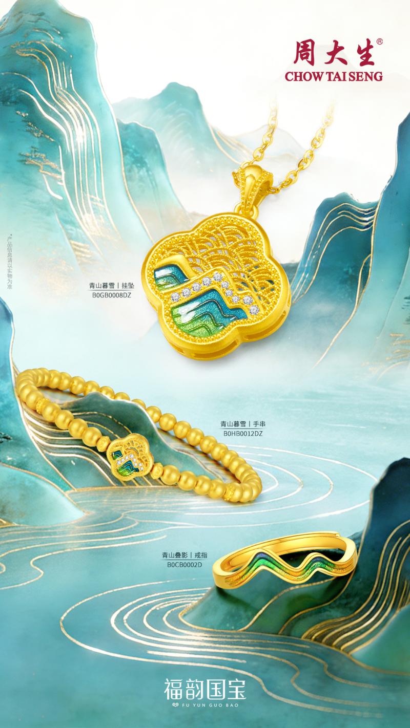 福韵国宝系列为周大生与央视《国家宝藏》栏目联名之作,让千年文物在当代焕发新生。系列“千里江山”主题产品,灵感源自故宫博物院藏北宋王希孟《千里江山图》这一青绿山水巅峰巨制。其中,“青山暮雪”套系,撷取画中起伏山峦、辽阔湖面之灵韵,运用古法镶嵌工艺与青绿珐琅,于黄金之上再现“青山绿水,绵延千里”的壮丽气象。产品寓意福气绵延、万古长青、幸福常在,将祖国锦绣河山的巍峨气象与盛世祝福,凝练为可佩戴的传家祥瑞,于新春之际致敬文明,馈赠挚爱。