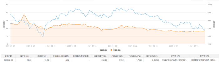 8月6日大宗交易成交268.26万股,成交额3492.75万元,占当日总成交额的46.03%,成交价13.02元,较市场收盘价13.78元折价5.52%。