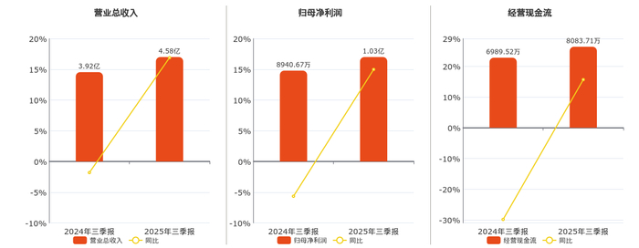 公司营业总收入为4.58亿元。归母净利润为1.03亿元。经营活动现金净流入为8083.71万元。