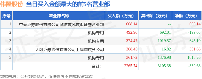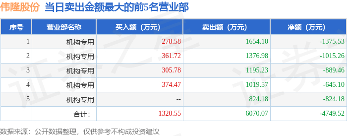 10月29日伟隆股份(002871)龙虎榜数据:机构净卖出4948.57万元