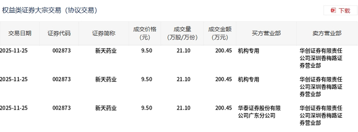 11月25日,新天药业大宗交易成交63.3万股,成交额601.35万元,占当日总成交额的10.4%,成交价9.5元,较市场收盘价10.8元折价12.04%。
