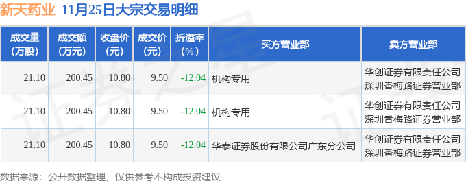 证券之星消息,11月25日新天药业发生大宗交易,交易数据如下: