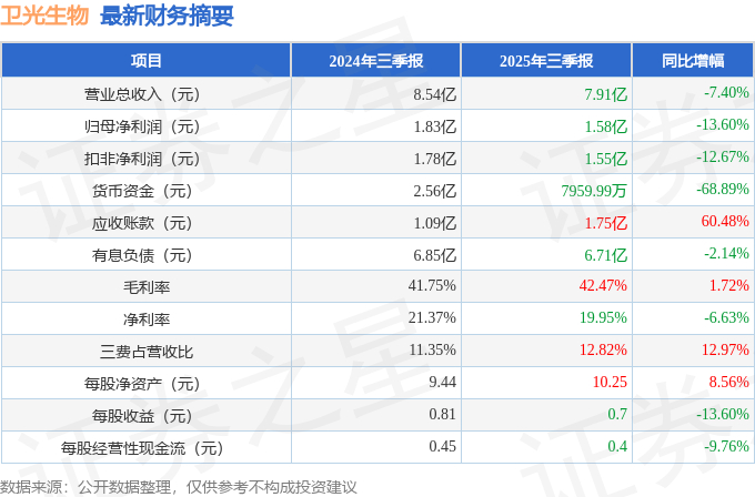 据证券之星公开数据整理,近期卫光生物(002880)发布2025年三季报。根据财报显示,卫光生物净利润同比下降13.6%。截至本报告期末,公司营业总收入7.91亿元,同比下降7.4%,归母净利润1.58亿元,同比下降13.6%。按单季度数据看,第三季度营业总收入2.73亿元,同比下降17.63%,第三季度归母净利润5021.42万元,同比下降31.06%。