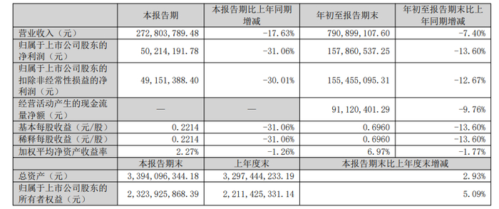 报告显示,卫光生物公司前三季度营业收入为7.91亿元,同比下降7.40%;归母净利润为1.58亿元,同比下降13.60%;扣非归母净利润为1.55亿元,同比下降12.67%;基本每股收益0.70元。