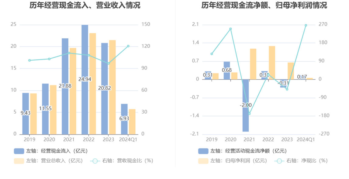2024年第一季度,公司营业收入现金比为120.71%,净现比为266.85%。