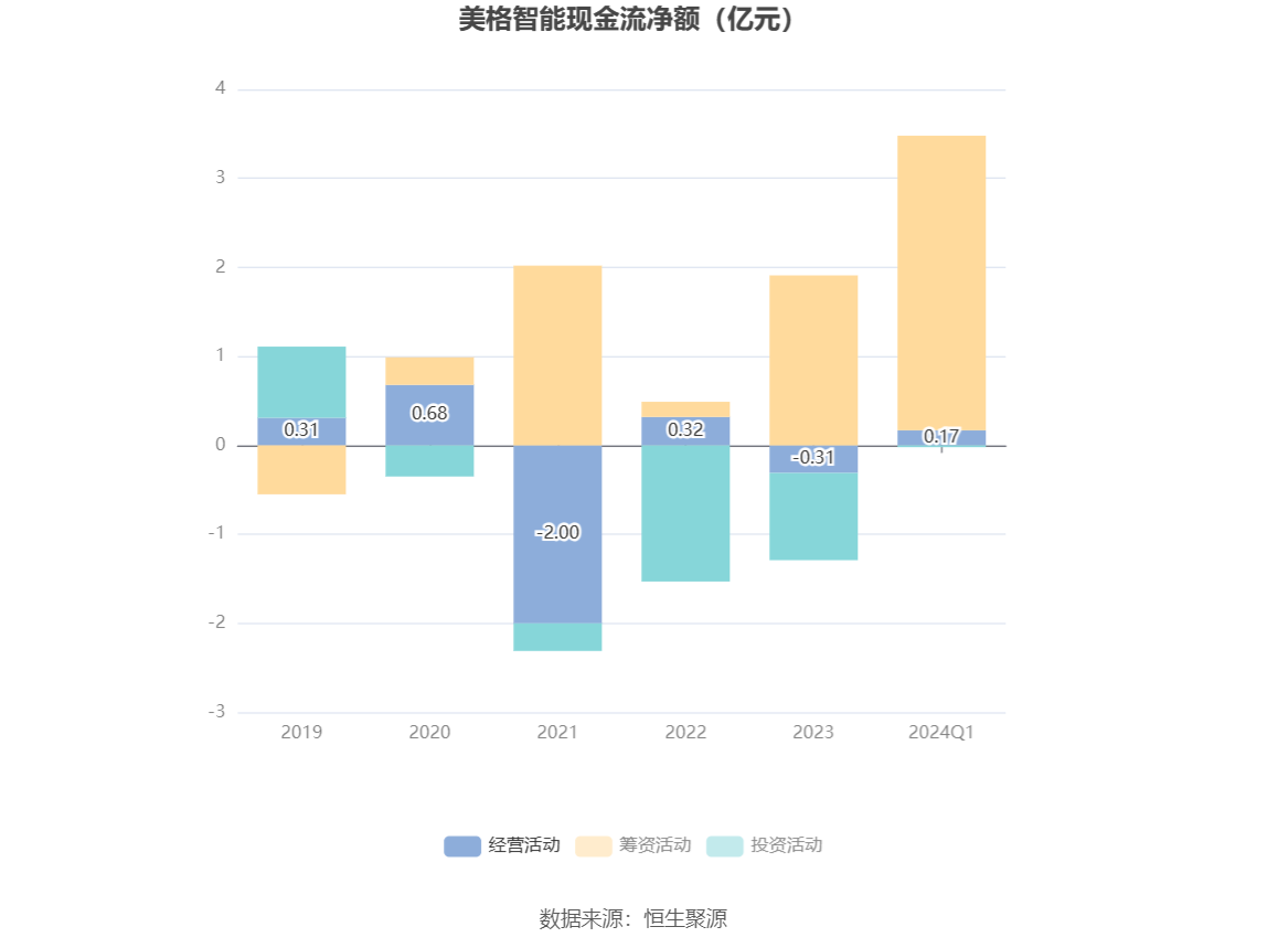 2024年第一季度,公司经营活动现金流净额为1725.69万元,同比增加5765.99万元;筹资活动现金流净额3.31亿元,同比减少2.99亿元;投资活动现金流净额-214.21万元,上年同期为-569.11万元。