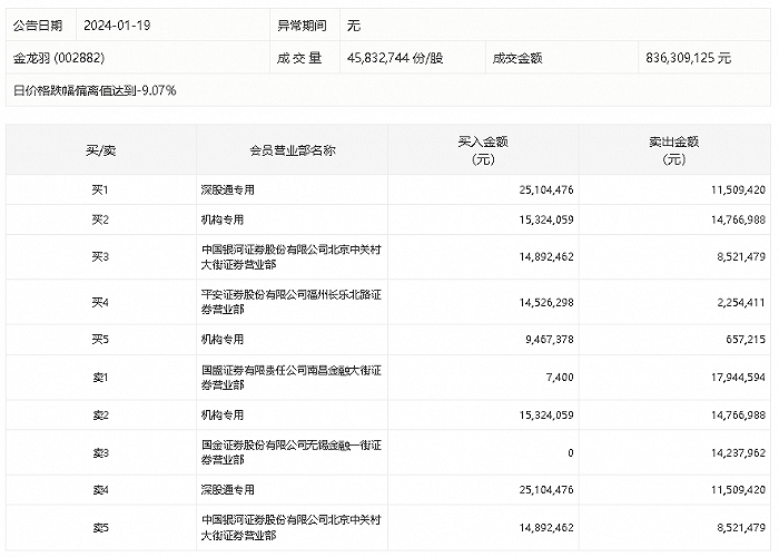 1月19日,金龙羽今日跌停,全天换手率达18.59%,振幅达6.6%。龙虎榜数据显示,营业部席位合计净买入943.0万元。其中,机构买入2479.14万元,卖出1542.42万元,合计净买入936.72万元。此外,国盛证券南昌金融大街证券营业部、国金证券无锡金融一街证券营业部分别卖出1794.46万元、1423.80万元;深股通专用、中国银河证券北京中关村大街证券营业部分别买入2510.45万元、1489.25万元。
