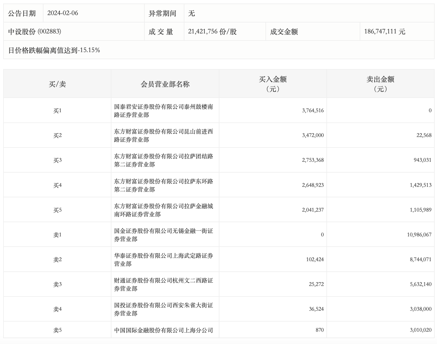 2月6日,中设股份今日跌停,全天换手率达15.82%,振幅达3.94%。龙虎榜数据显示,营业部席位合计净卖出2006.63万元。其中,国金证券无锡金融一街证券营业部、华泰证券上海武定路证券营业部分别卖出1098.61万元、874.41万元;国泰君安证券泰州鼓楼南路证券营业部、东方财富证券昆山前进西路证券营业部分别买入376.45万元、347.20万元。