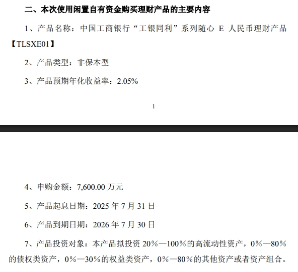 8月1日,凌霄泵业(002884)公告称,7月31日,公司使用闲置自有资金人民币7,600.00万元向中国工商银行股份有限公司购买了名为“中国工商银行‘工银同利’系列随心E人民币理财产品【TLSXE01】”的非保本型理财产品,该理财产品到期日为2026年7月30日。